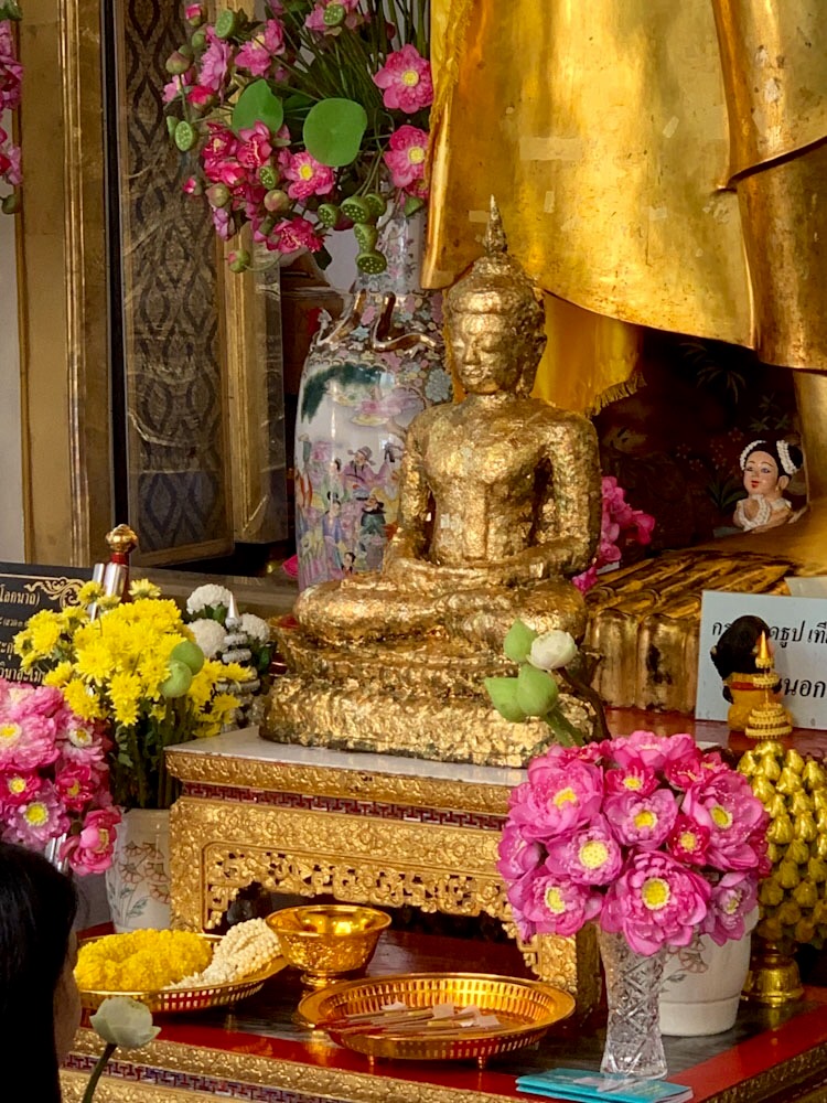 Ce Bouddha en méditation, posé aux pieds du Bouddha Deva Patimakorn, est couvert de petites feuilles d’or appliquées par les pèlerins. Wat Pho, Bangkok, Thaïlande