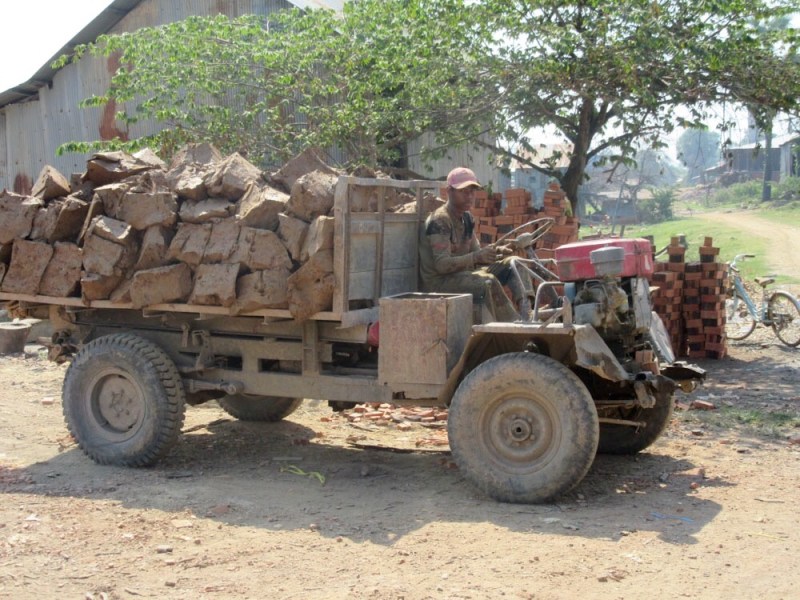 La glaise est découpée à la pelle puis transportée par camion jusqu’à la fabrique tout près. Kratie, Cambodge.