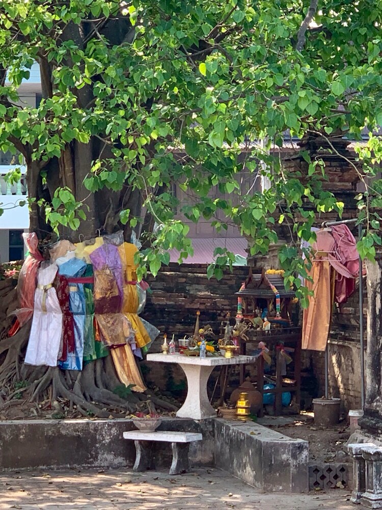 Un petit coin de verdure avec un autel au Wat Khudeedao, Ayutthaya, Thaïlande.