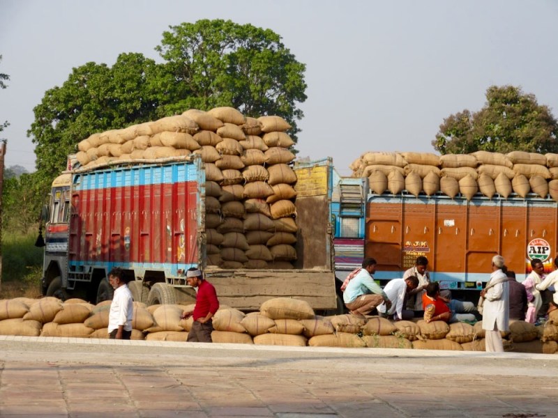 Des chargement de sacs de riz sont acheminés à la gare. Inde.