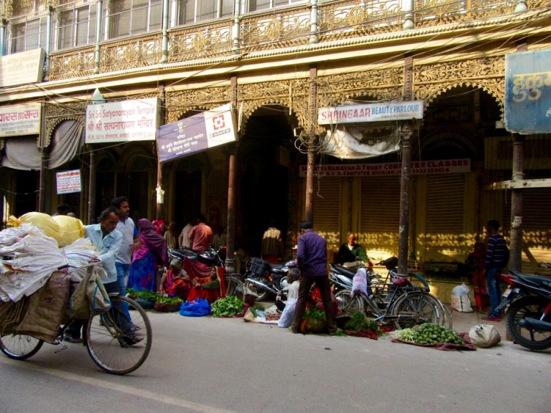 Un marché a élu domicile devant une maison ancestrale le long d’une rue achalandée, Varanasi, Inde.