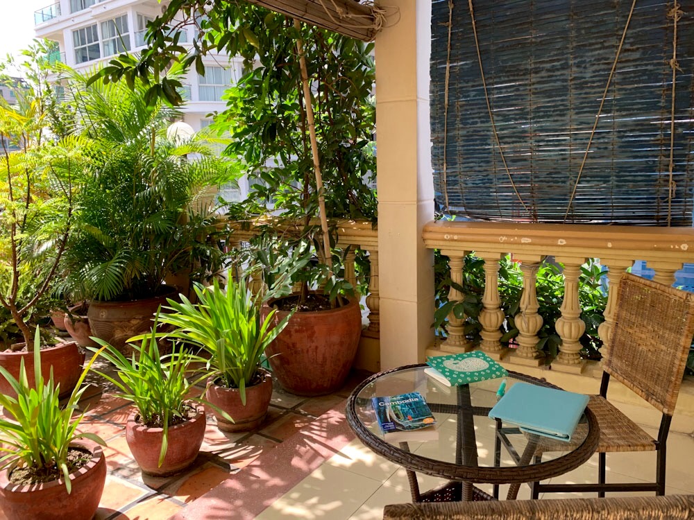 Un petit coin calme sur la terrasse, à l’étage supérieur de l’hôtel Anise, juste devant notre chambre. Phnom Penh, Cambodge.