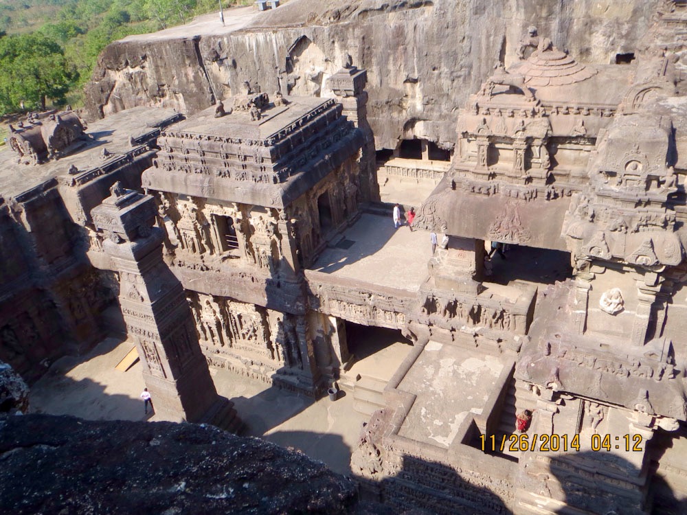 Nous avons grimpé plus haut afin d’avoir une meilleure vue sur la seule construction d’Ellora qui n’est pas une grotte, mais plutôt une immense structure à ciel ouvert. Inde.