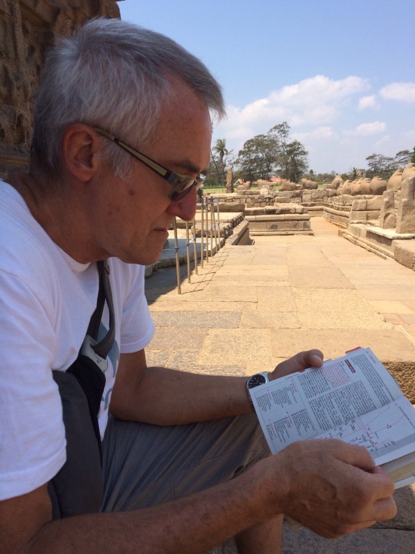 Robert qui me lit la description des monuments au Shore Temple