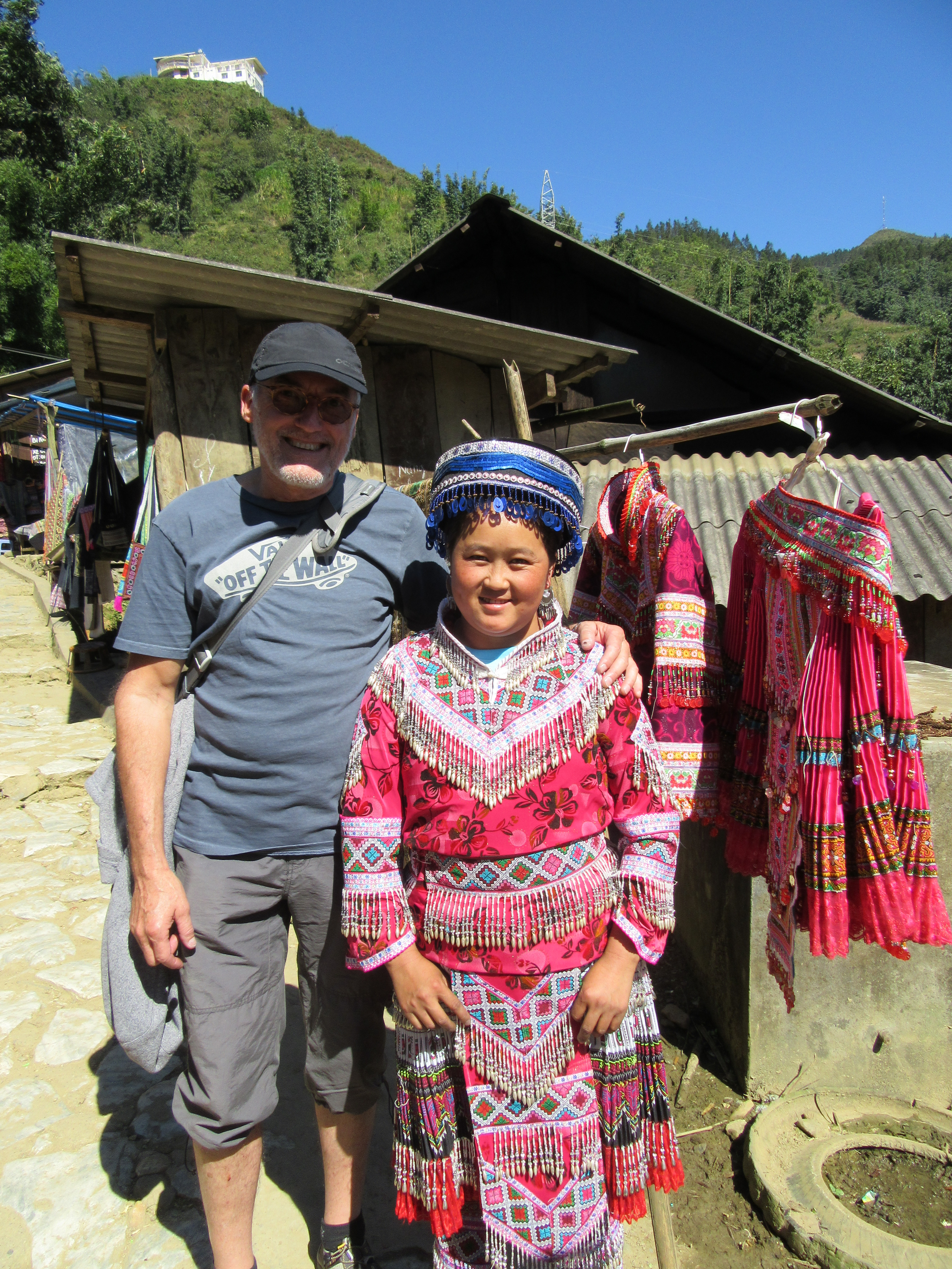 La marchande porte les vêtements traditionnels qu’elle vient d’acheter