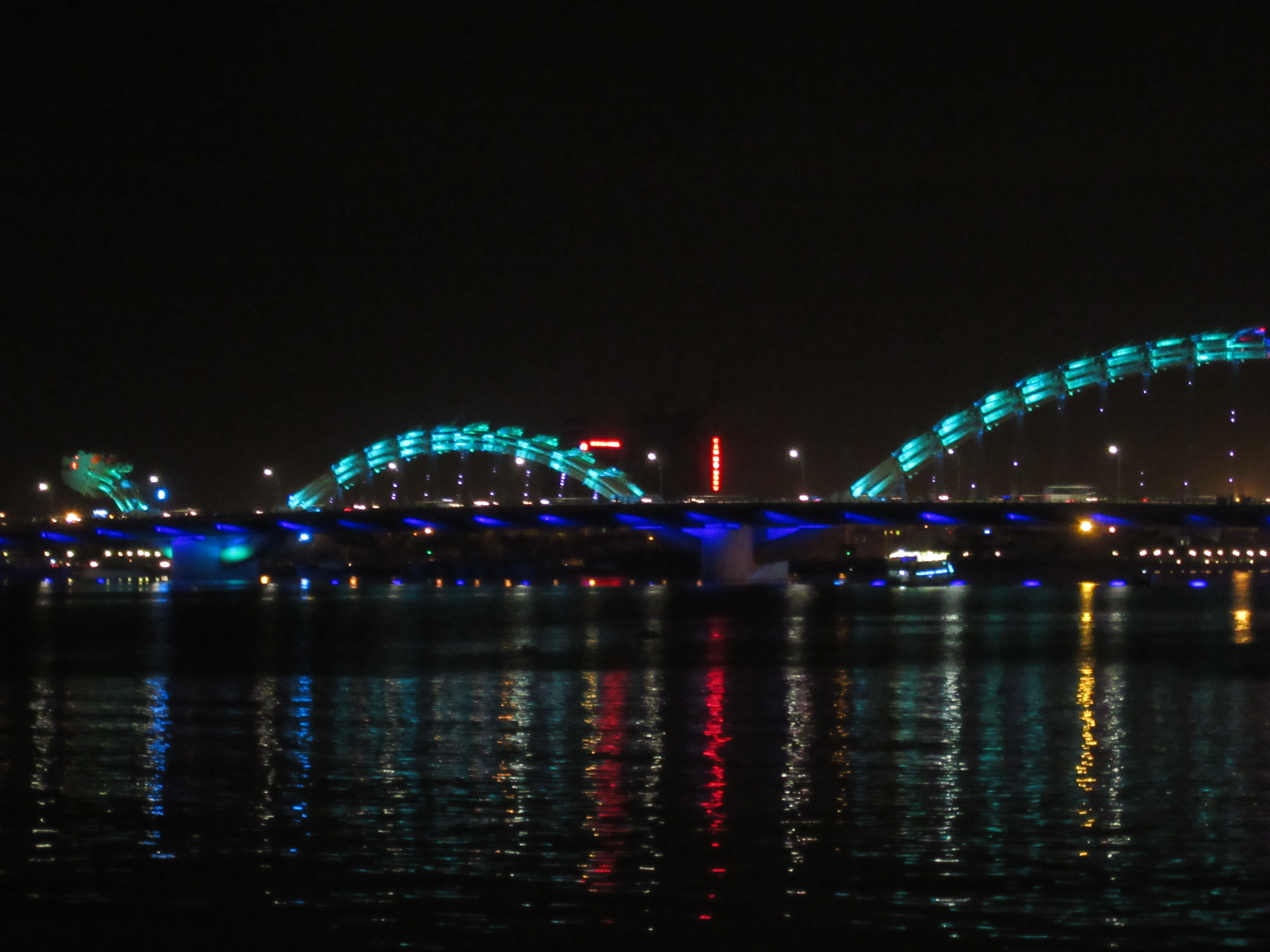 Le pont du dragon le soir vu de la promenade Bach Dang, Da Nang