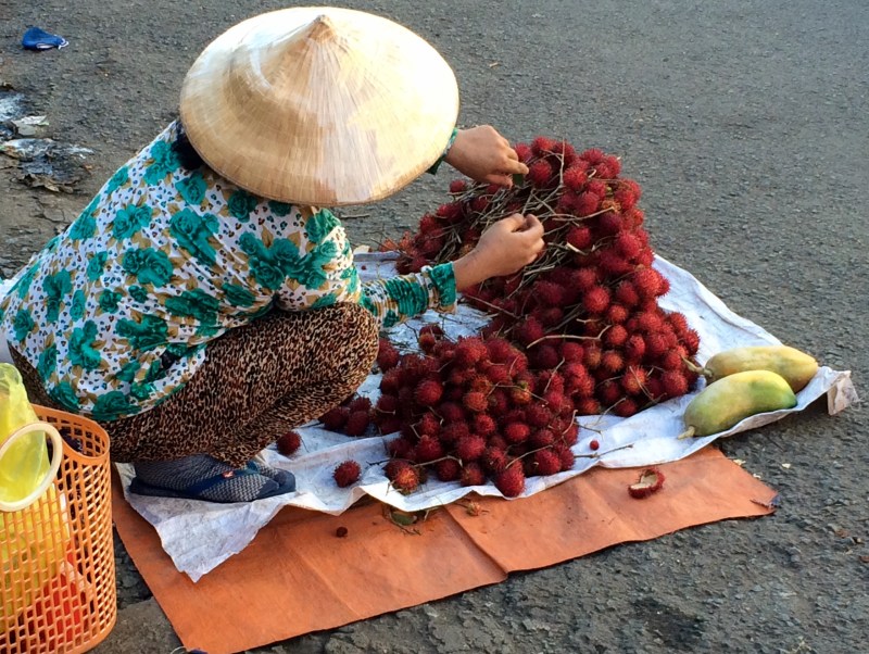 Vendeuse de litchis, marché de Vinh Long, Vietnam