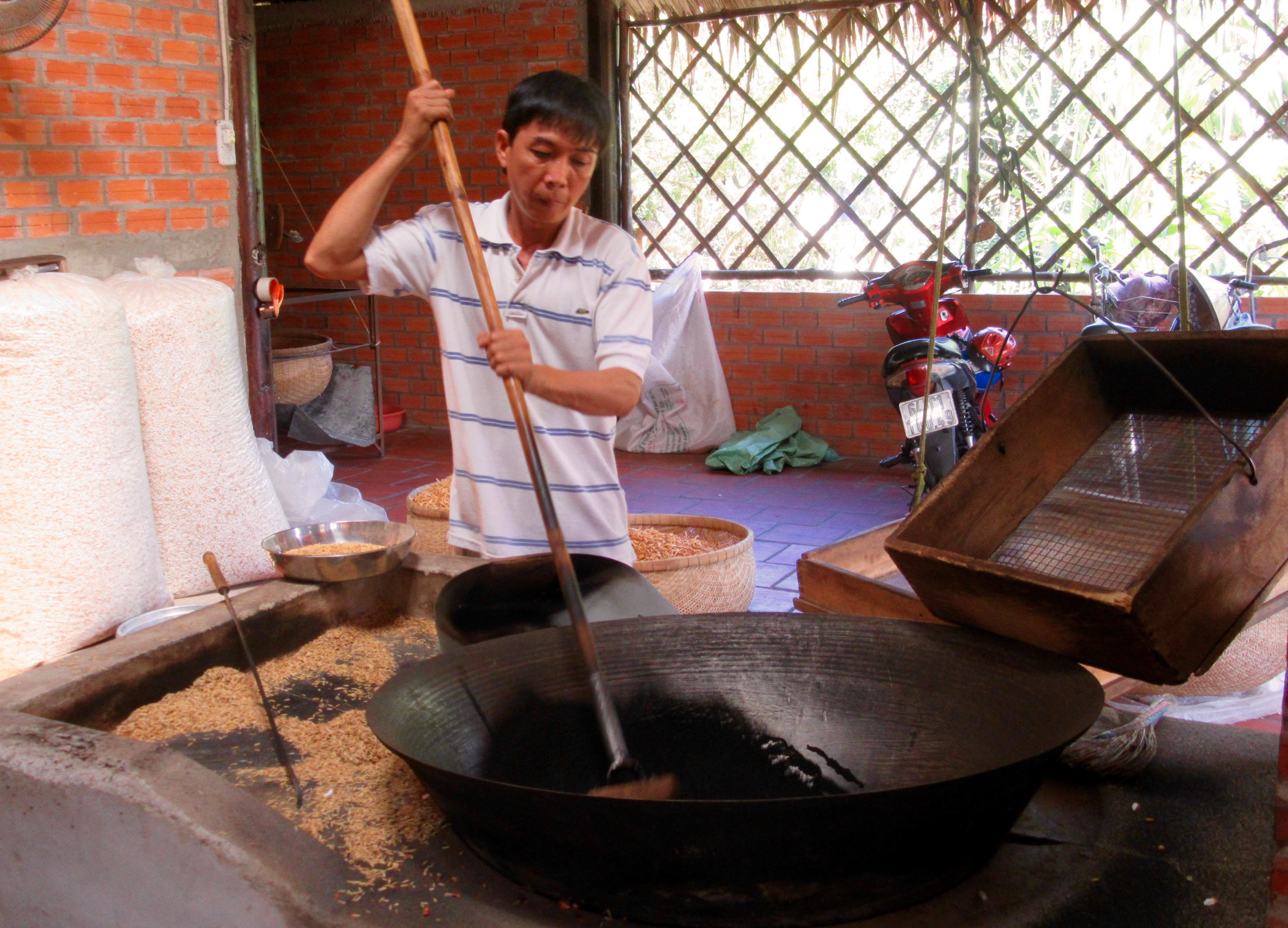 Le riz est soufflé dans une grande marmite à l’aide de sable chaud et un feu brûlant, région de An Binh, Vietnam