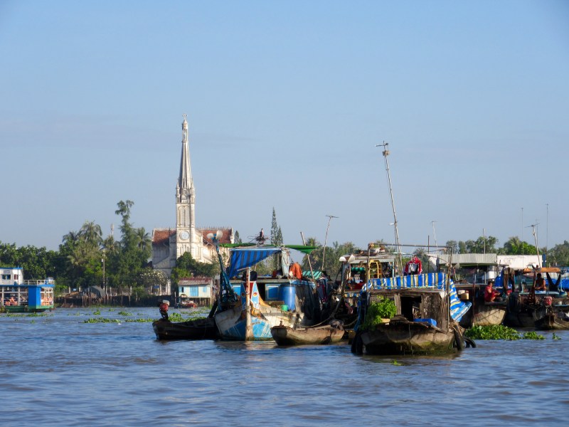 Le marché flottant de Cái Be avec son clocher en arrière plan.
