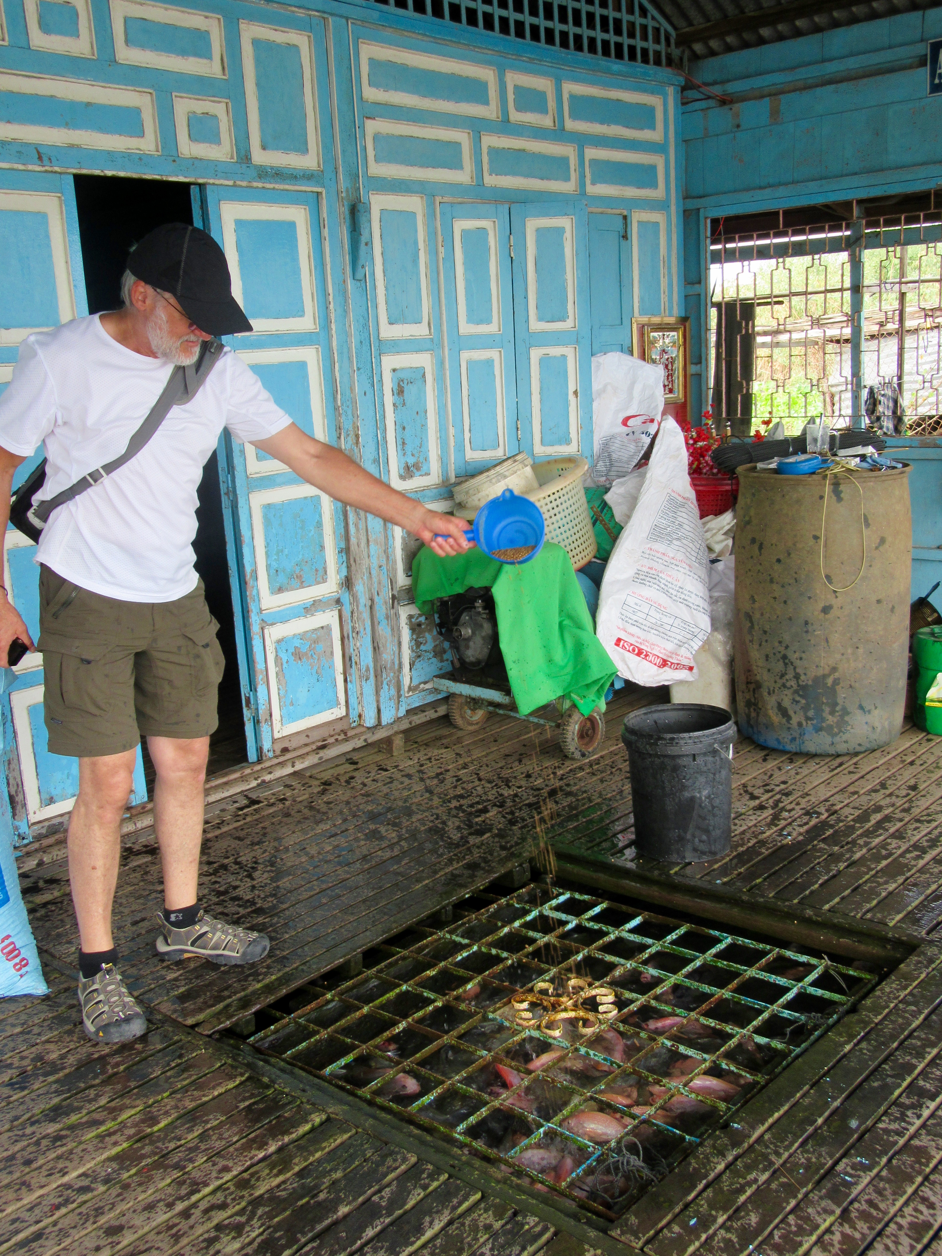Nourrir les poissons d’élevage, Chau Doc, Vietnam