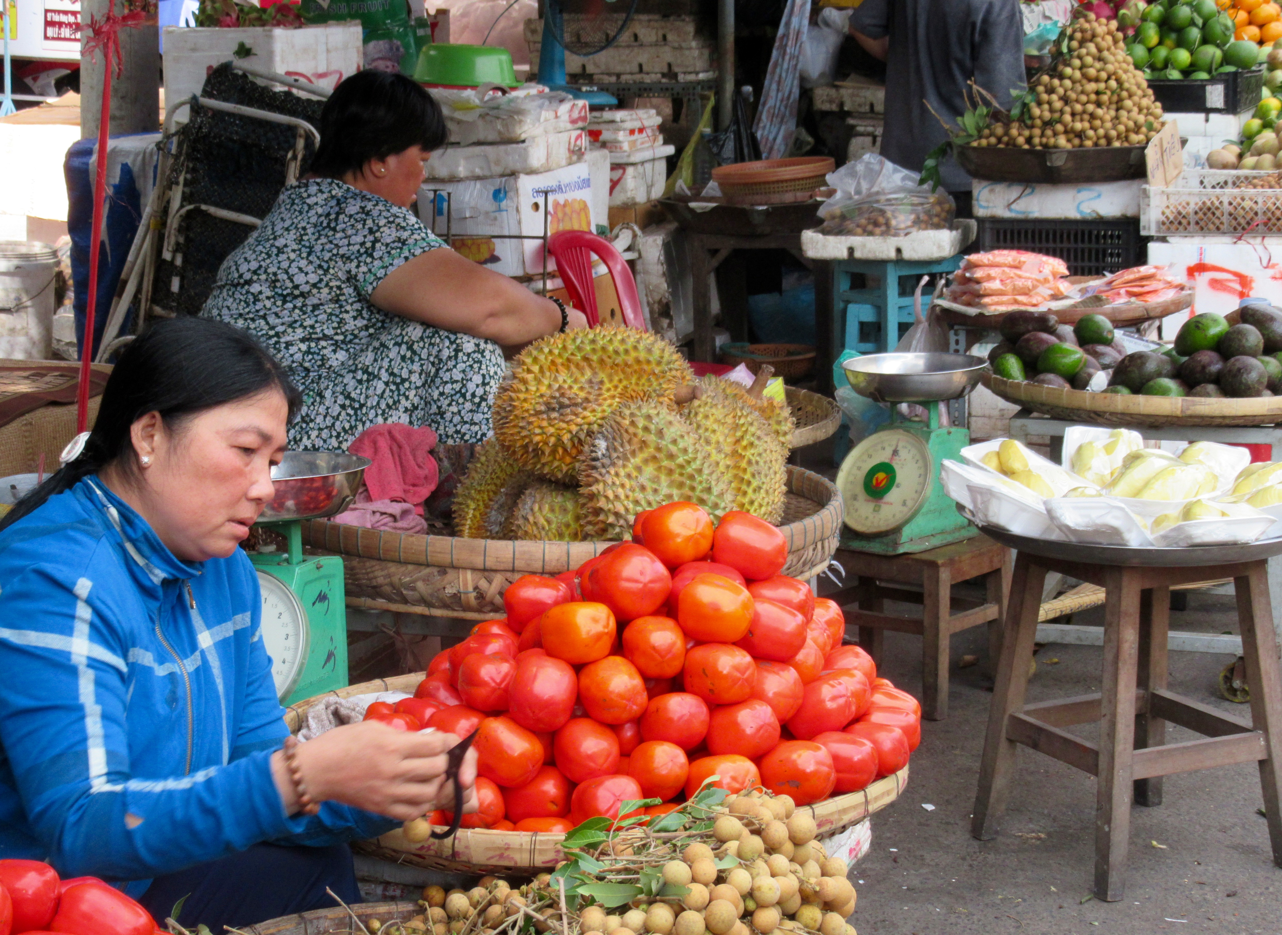 L’odeur des durians ne trompe pas, ils sont juste derrière les tomates! Marché de Chau Doc, Vietnam