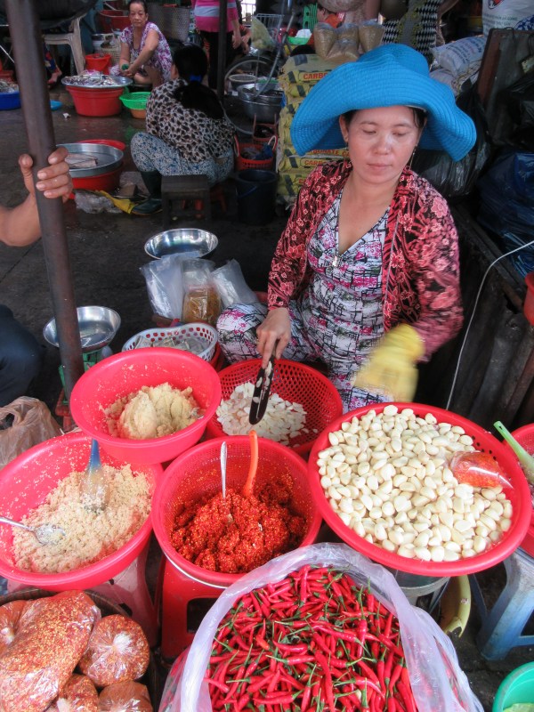 Préparation de l’ail avant la vente, marché de Chau Doc, Vietnam