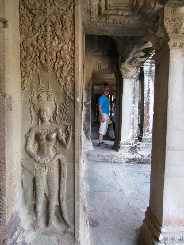 Robert au Wat Angkor, une apsara apparaît au premier plan, Cambodge