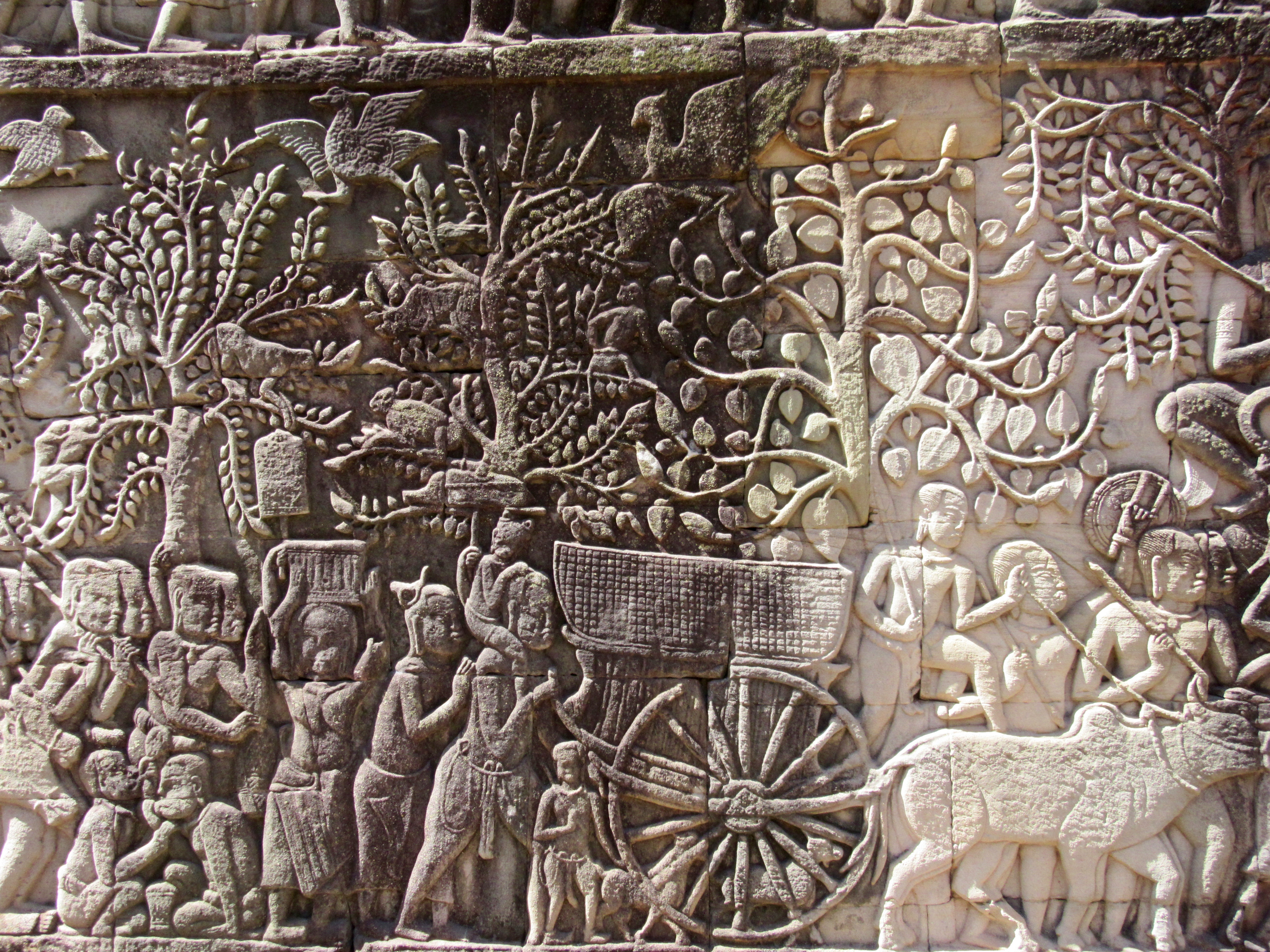 Bas-relief illustrant la vie quotidienne des paysans Khmer à Bayon, Angkor, Cambodge