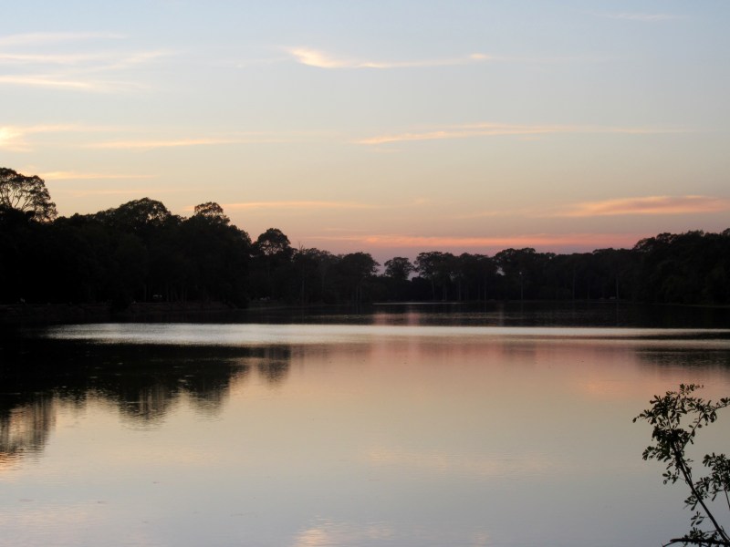 Coucher du soleil sur les douves entourant Angkor Wat, Cambodge