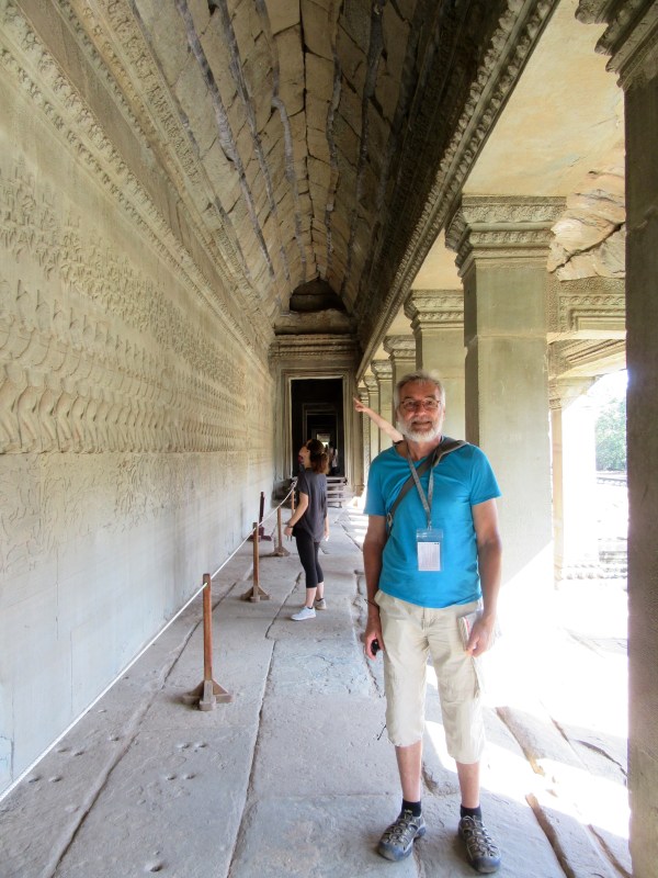 Robert devant les bas-reliefs relatant le barratage de la mer de lait, un épisode de la création du monde, Angkor Wat, Cambodge