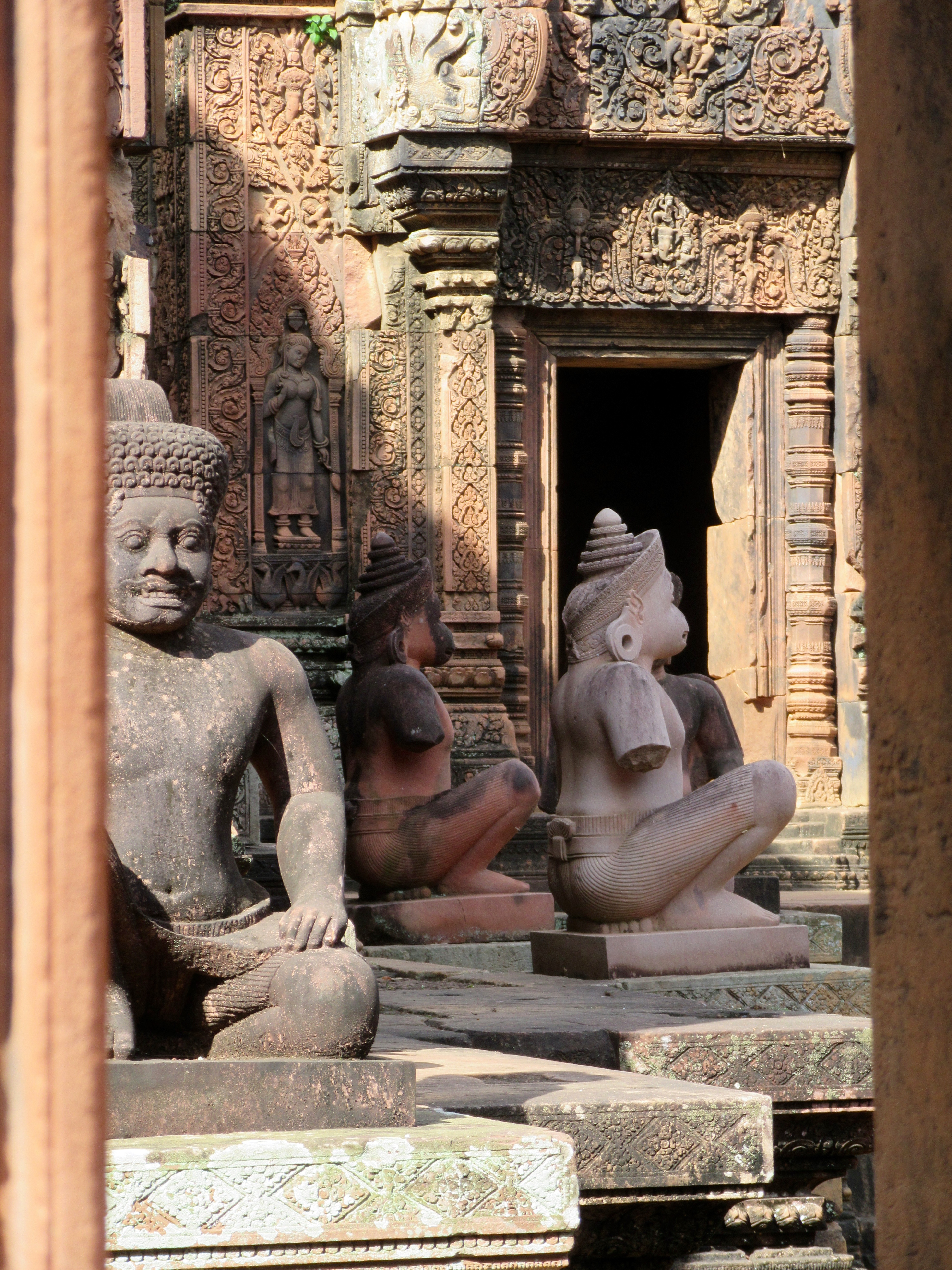 Les statues de pierre contrastent avec la couleur ambrée du latérite, Bantaey Srei, Angkor, Cambodge