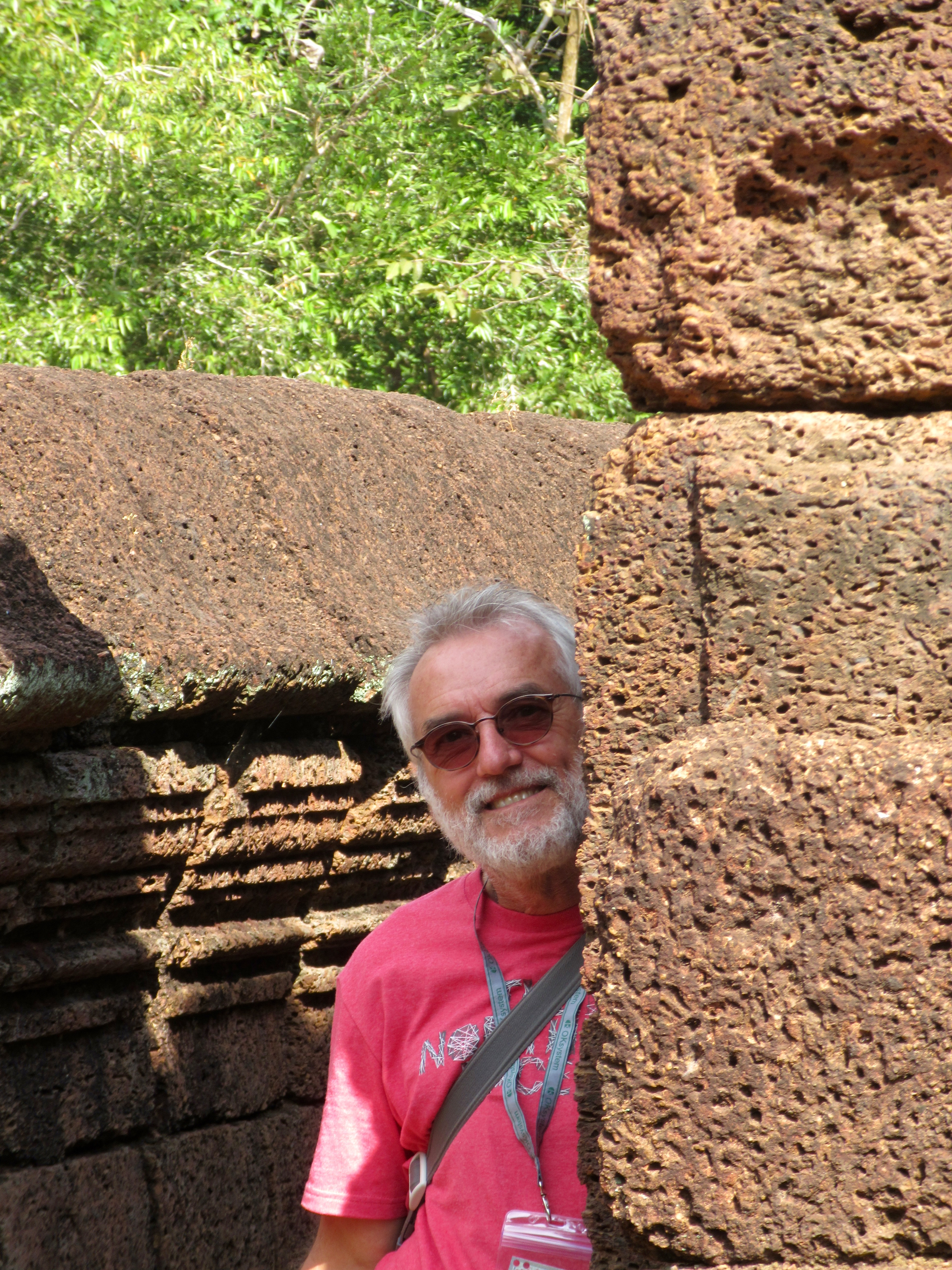 Robert derrière un mur de latérite, Bantaey Srei, Angkor, Cambodge