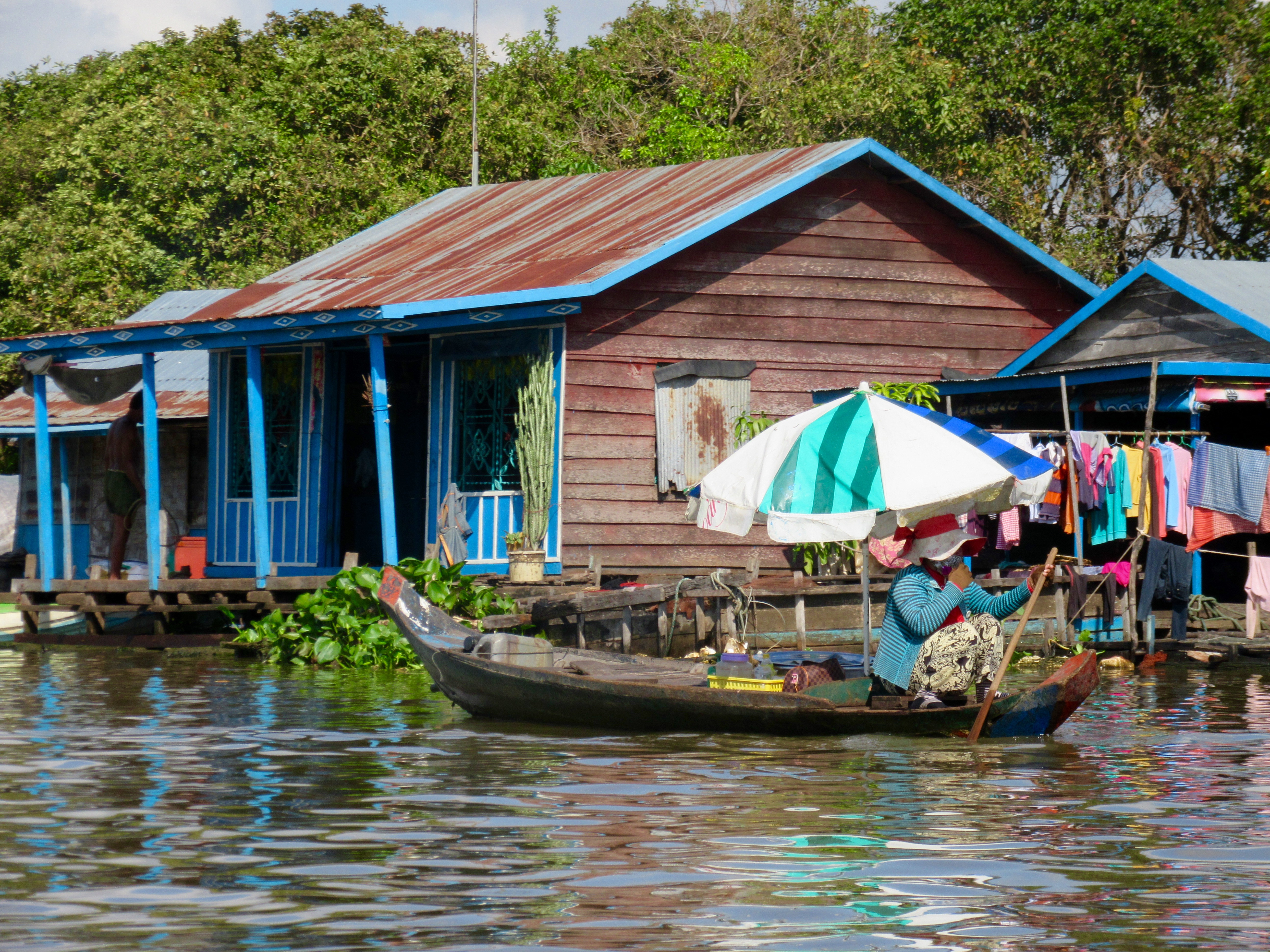 Une femme bien protégée du soleil, village flottant du Tonlé Sap, Cambodge