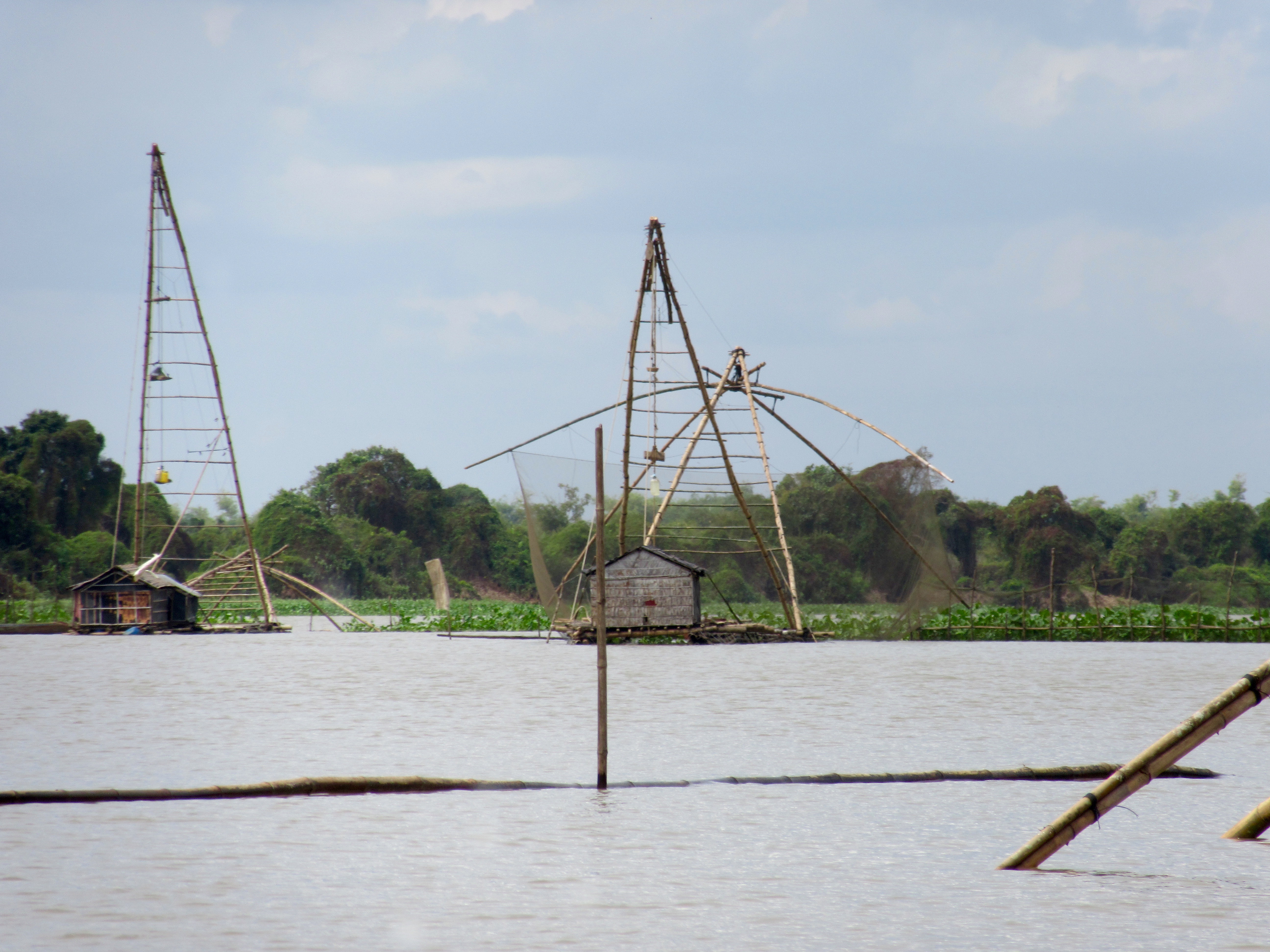 En remontant un canal du Tonlé Sap nous observons des carrelets, Battambang, Cambodge