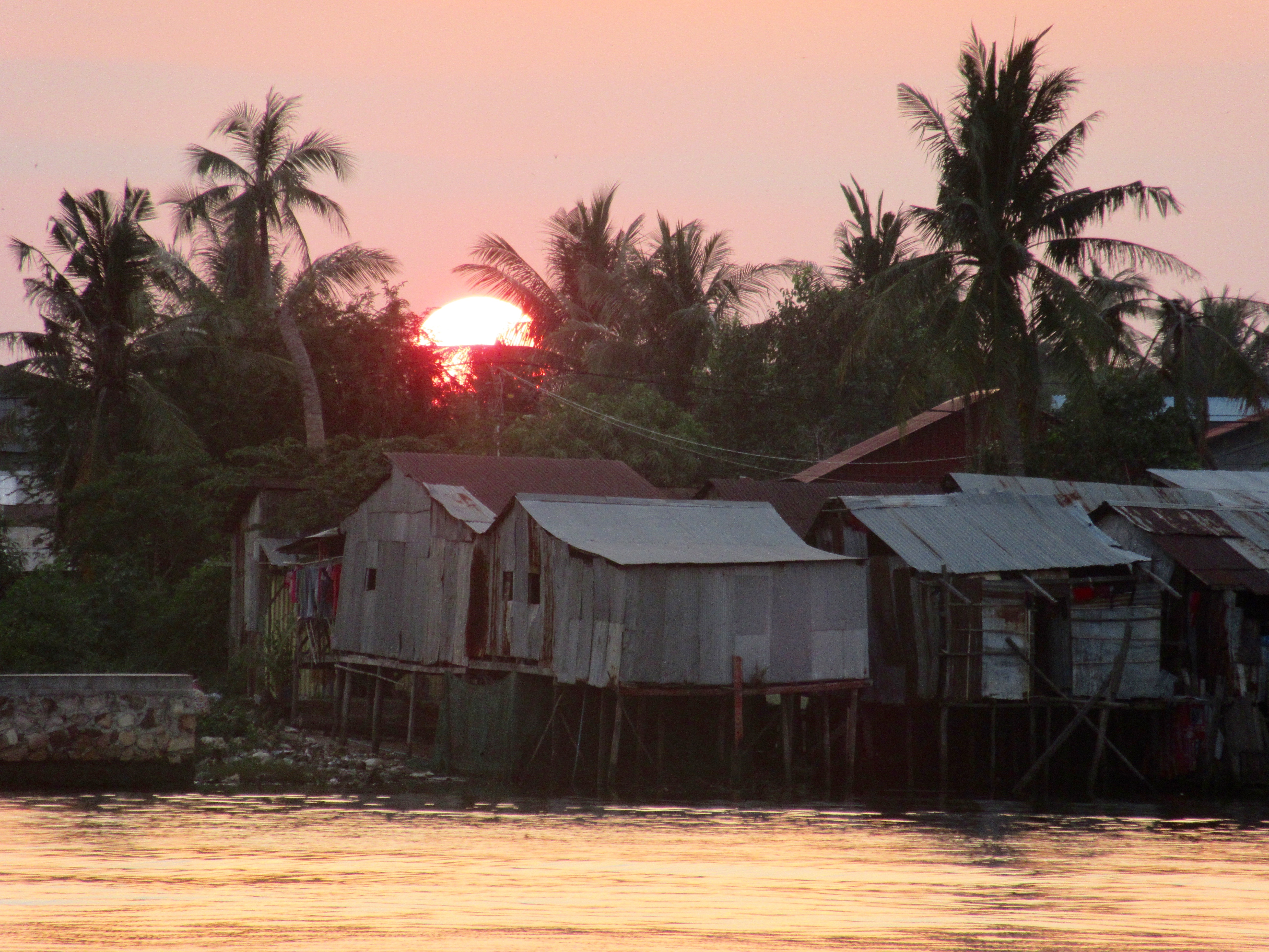 Coucher de soleil sur les maisons bordant la rivière à Kampot, Cambodge