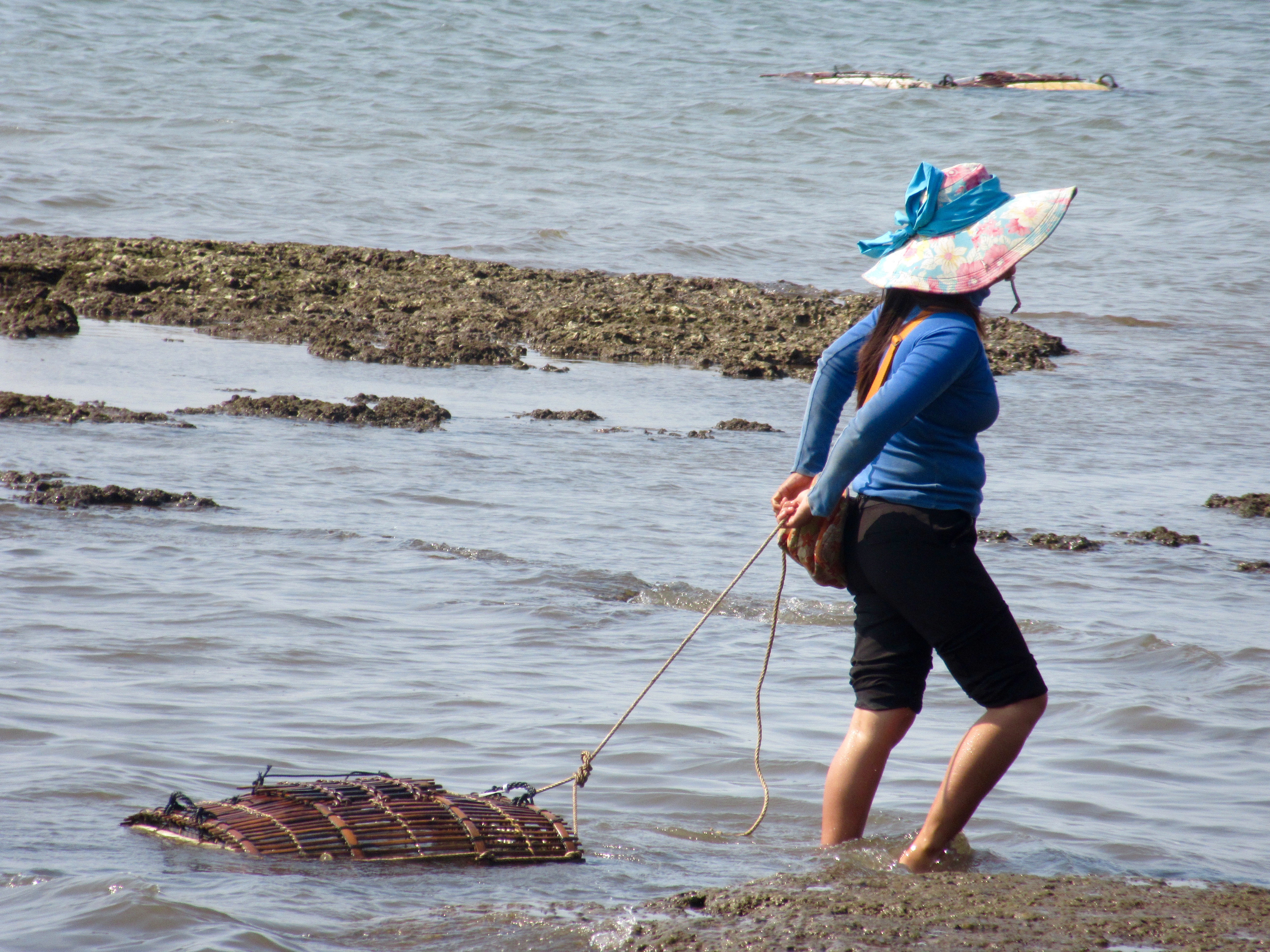 Une jeune femme tire une cage de crabe hors de l’eau près des restaurants à Kep, Cambodge