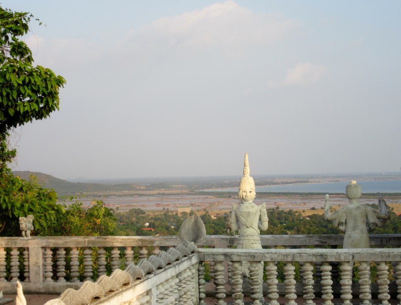 Vue de la mer du haut de la terrasse d’un temple à Kep, Cambodge