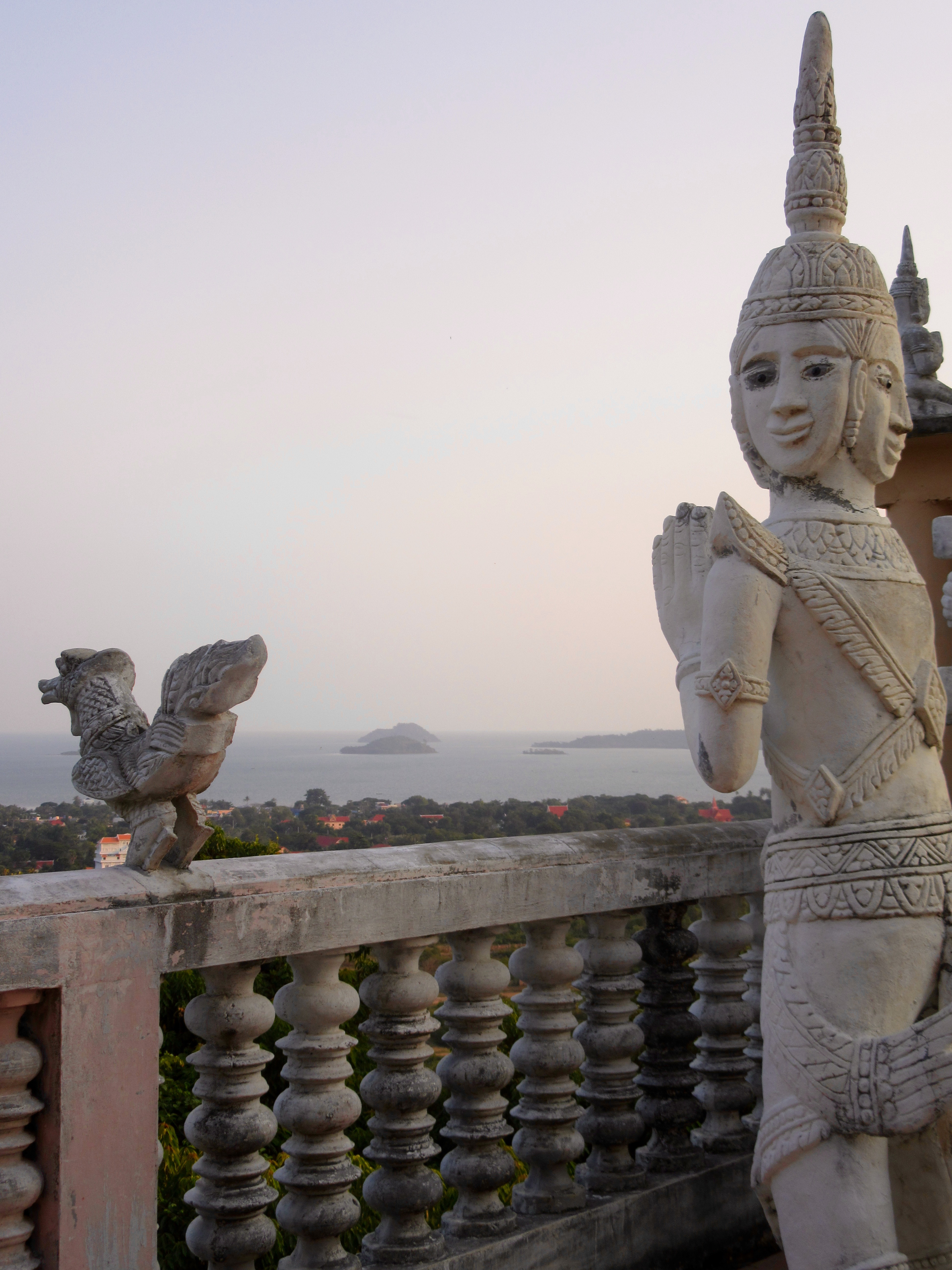 Du haut de la terrasse d’un temple dans la montagne il est possible de voir des îles situées au Vietnam, Cambodge