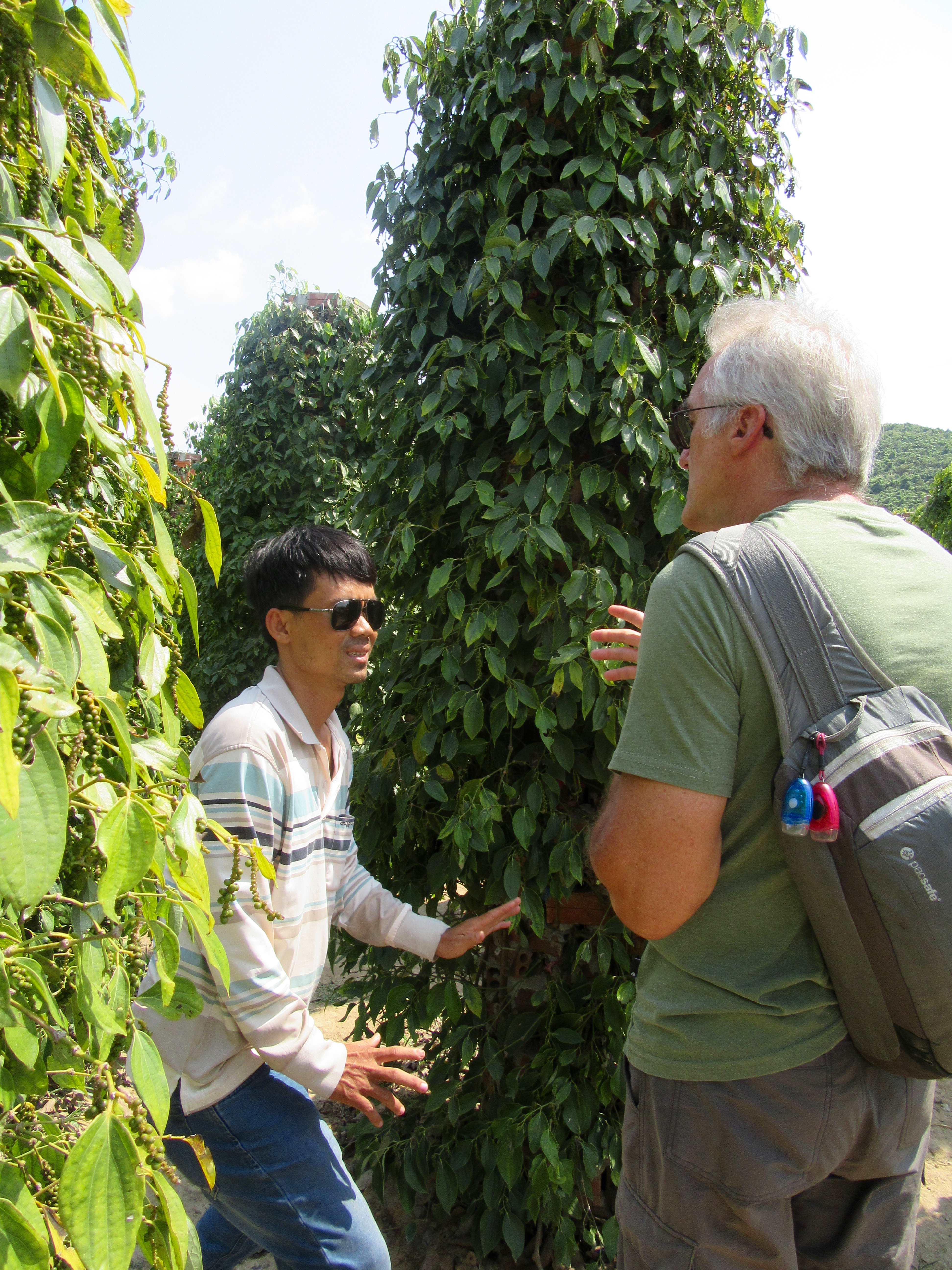 Robert et notre chauffeur de tuk tuk dans la plantation de poivre, Starling Farm, Kampot, Cambodge