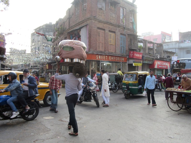 Un homme traverse la rue avec sa petite échoppe sur la tête, il se prépare pour sa journée, Kolkata, Inde