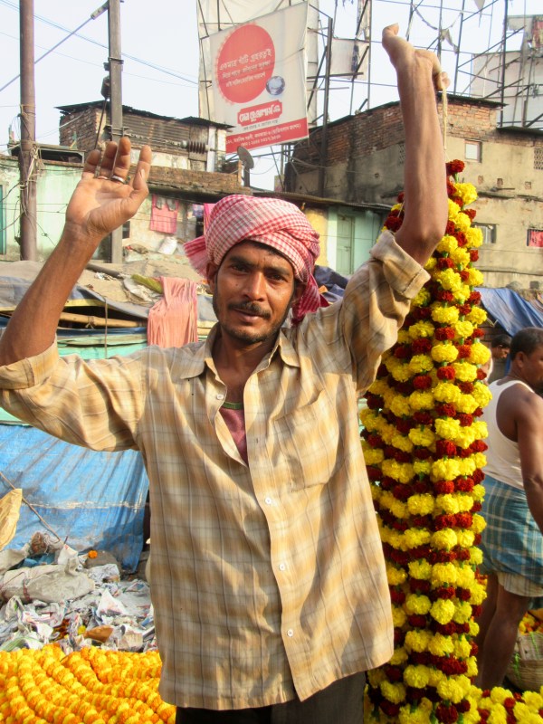 Un vendeur de guirlandes de fleurs, marché aux fleurs, Kolkata, Inde
