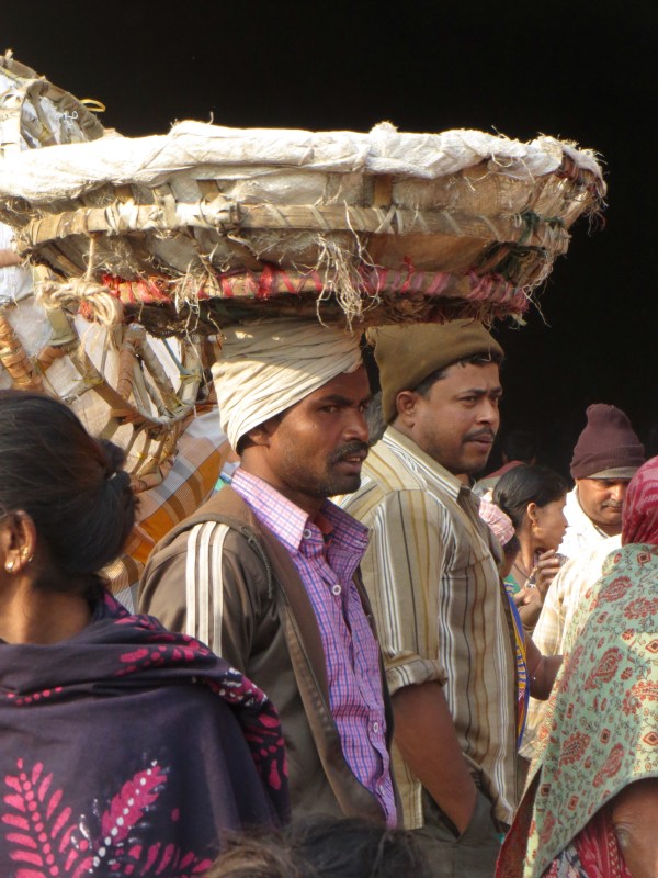 Photo de Robert: un homme avec un grand panier sur la tête, il servira à transporter les fleurs nouvellement achetées, Marché aux fleurs, Kolkata, Inde