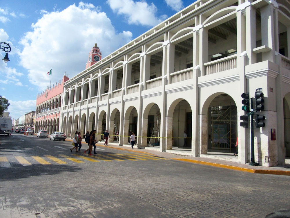 L’édifice rose accueille les danses traditionnelles devant ses arcades. L’édifice blanc abrite des commerces au rez-de-chaussée dont une librairie. Mérida, Yucatán, Mexico.