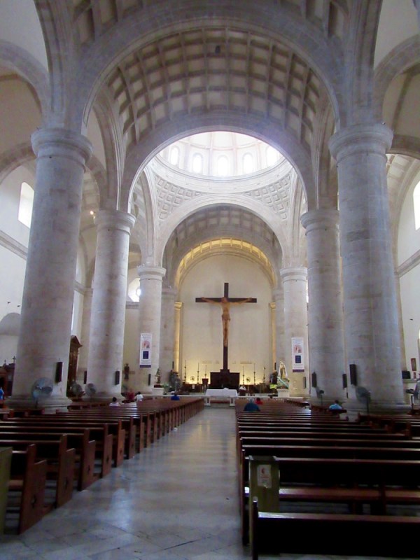 L’intérieur de la Catedral est d’une grande sobriété. Observez le grand crucifix derrière l’autel. Mérida, Yucatán, Mexique.