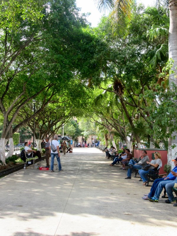 Les bancs de parc du Zocalo accueillent des gens de tous les âges pour faire un brin de jasette, pour profiter de la fraîcheur des arbres ou simplement surfer sur internet ‘Inalámbrico’. Mérida, Yucatán, Mexique.