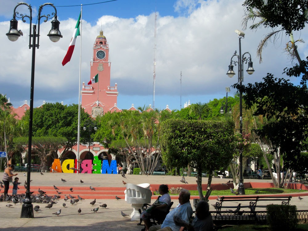 Les enfants nourrissent les pigeons alors que d’autres profitent des derniers rayons de soleil. Mérida, Yucatán, Mexique