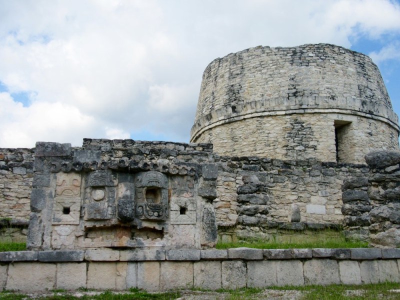 L’observatoire de Mayapan avec en avant-plan un masque représentant le dieu Chaac, Yucatán, Mexique.