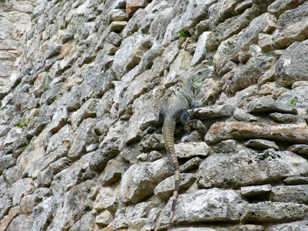Un petit iguane se prélasse sur l’un des murs du Castillo, presque invisible à travers les pierres grises. Mayapan, Yucatán, Mexique.