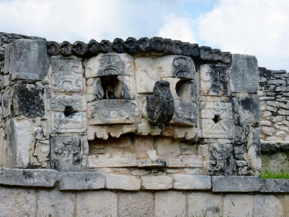 Un des masques ornant le temple du dieu Chaac, Mayapan, Yucatán, Mexique.
