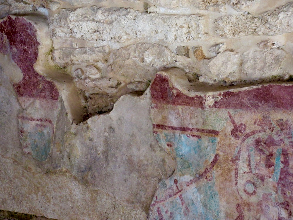 La possibilité d’observer ces peintures de l’époque précolombienne, protégées des intempéries sous une palapa, nous fascine à chaque fois. Mayapan, Yucatán, Mexique.
