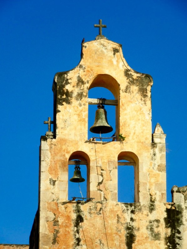 Deux clochers coiffent l’église San Miguel Arcangel. Leurs silhouettes se détachent sur le ciel de Mani en cette fin d’après-midi, Yucatán, Mexique.