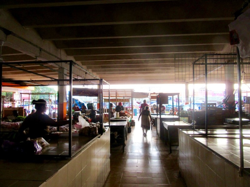 Intérieur du marché d’Oxkutzcab en fin d’après-midi. Les marchandes nettoient leur étal alors que la lumière du soleil s’estompe tranquillement, Yucatan, Mexique