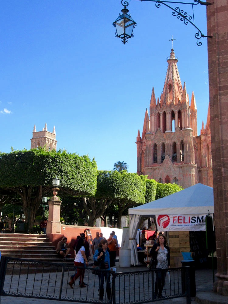 Une autre journée se lève sur la Parroquia et le Jardin. Aujourd’hui, la rue devant les arcades est l’hôte des bouquinistes de la région. San Miguel de Allende, Guanajuato, Mexique.
