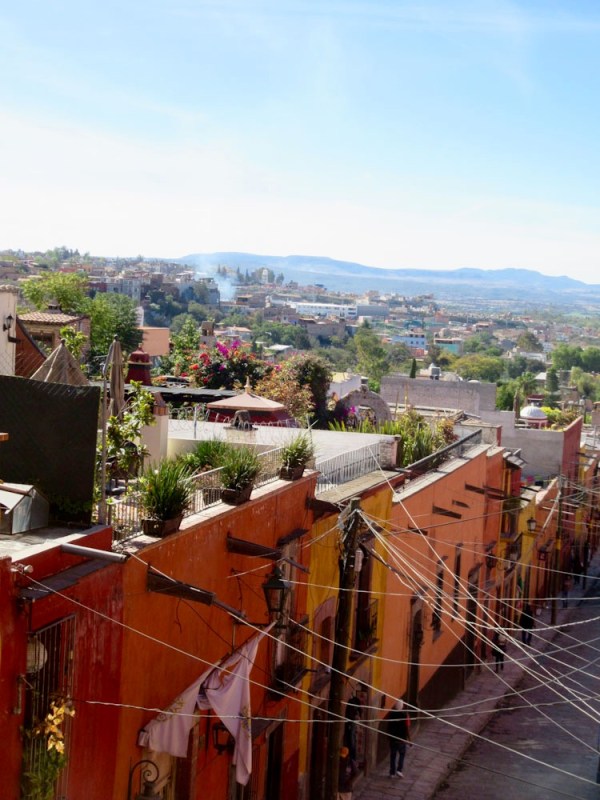 Le petit pont de la rue Quebrada offre une vue imprenable sur l’historique rue Canal et les toits des maisons qui la bordent, San Miguel de Allende, Guanajuato, Mexique.