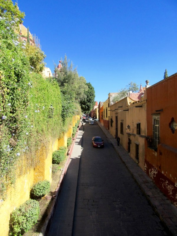 La rue Canal, une de mes vues préférées, à partir du pont de la rue Quebrada. A gauche, le mur de l’église de l’immaculée Conception, San Miguel de Allende, Guanajuato, Mexique.