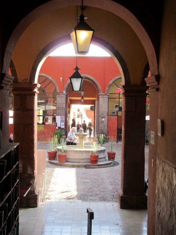 Vue sur la fontaine de la cour intérieure de la Biblioteca Pública de San Miguel de Allende à partir des salles sous les arcades, Guanajuato, Mexique.