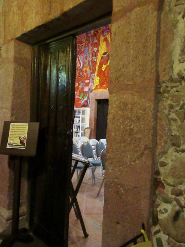 La sala Quetzal avec son plafond et ses murs couverts de fresques. Une enseigne indique que la prise de photos est défendue, mais je n’ai pas résisté à l’envie de vous montrer un aperçu par la porte entrouverte. San Miguel de Allende, Guanajuato, Mexique.