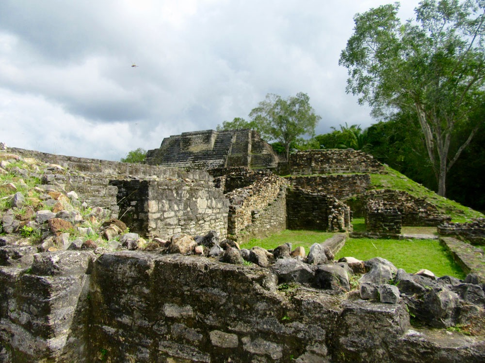 Vestiges de ce qui étaient probablement des appartements, à l’arrière plan, nous apercevons le Temple of the Masonry Altars ou le Temple of the Sun God, Altun Ha, Belize District, Belize.