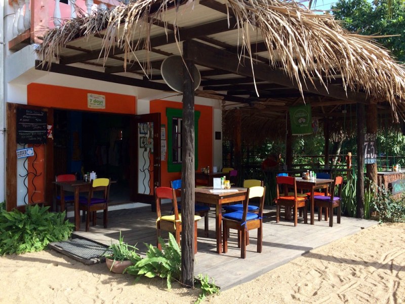 Comme la plupart des commerces et des maisons, le Thongs Café est construit sur le sable. Ses chaises peintes et les coussins assortis, rendent le café très accueillant. Sur la terrasse à droite, des balançoires remplacent les chaises. C’est joli! Hopkins, Stann Creek District, Belize.