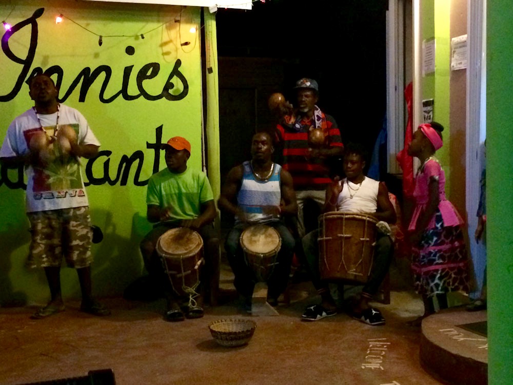 Tous les lundis soirs, le restaurant Innies offre un spectacle de jembe avec des chansons Garifunas. Hopkins, Stann Creek District, Belize.
